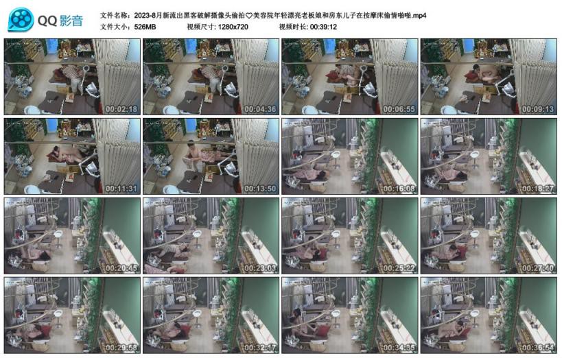 【影片名称】:新流出黑客破解摄像头偷拍美容院年轻漂亮老板娘和房东儿子在按摩床偷情啪啪【影片格式】:MP4【影片大小】:526MB【影片时间】:00:39:12【影片说明】:无码【影片截图】: